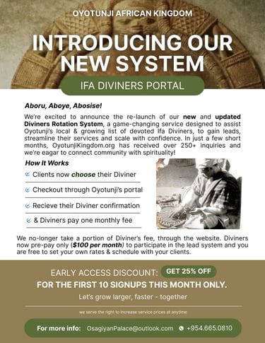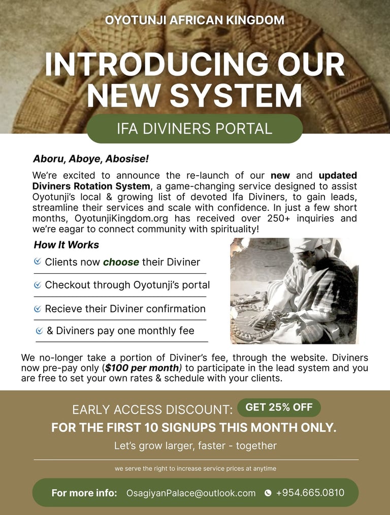 In just a few short months, OyotunjiKingdom.org has received over 250+ email inquiries. Take advantage of this month's introductory launch promotion and receive 25% OFF your 1st month. Promotion is valid for the first 10 Diviners who participate in the new lead system. Valid for the month of October, only!